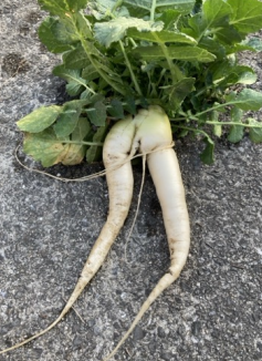 地表近くに太い間伐材が入っていると、大根の根がそれを避けて成長します。その結果、写真のように二又・三又の大根になってしまいました(笑)
